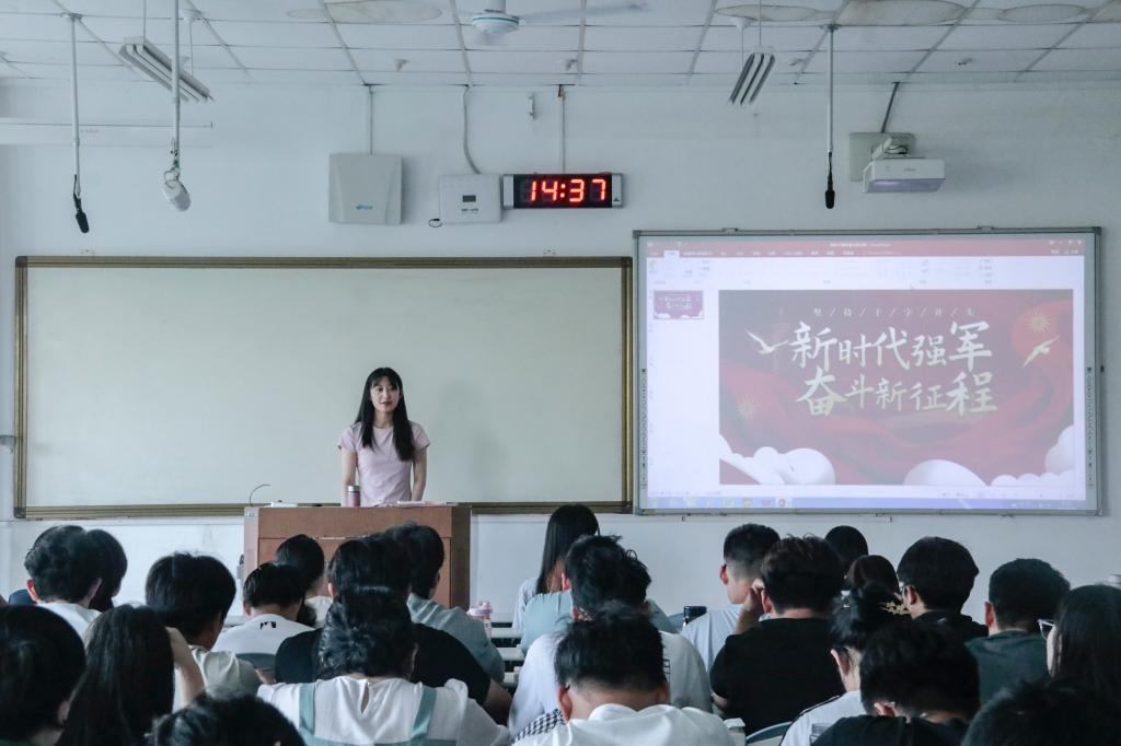 课堂上,采矿工程2023级本科生吴方灿、马克思主义理论2024级硕士研究生刘允静和尹路宁三位同学结合各自所知所学,从不同角度深入浅出地解读了习近平强军思想的核心要义,展现了新时代青年对国防建设的深刻理解和责任担当。安全工程2023级本科生郭忠菲介绍了实践研学活动的主要内容,分享了自己对“红”与“蓝”的理解,认为新时代青年应当自觉传承红色基因、勇担科技报国使命。马克思主义理论2024级硕士研究生周紫晗认为,新时代国家安全面临的新形势与新挑战,需要青年一代努力奋斗,在理论与实践结合中为国防现代化建设贡献青春力量。朝鲜语2023级本科生雷美佳呼吁青年学子既要增强国家安全意识,又要发挥自身专业所长,在国际传播等领域为强军事业贡献青春智慧。